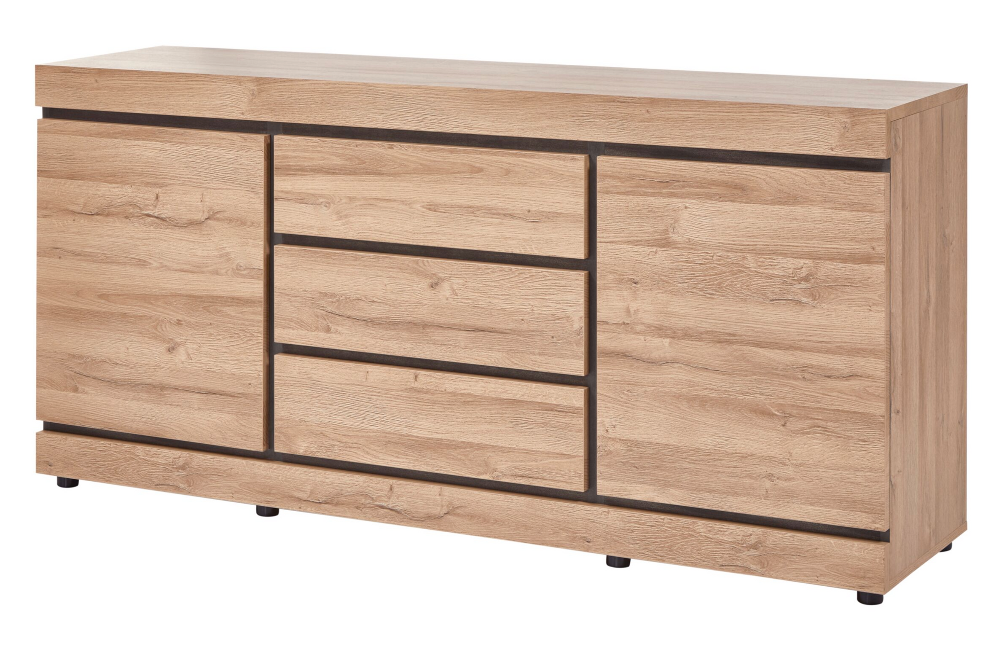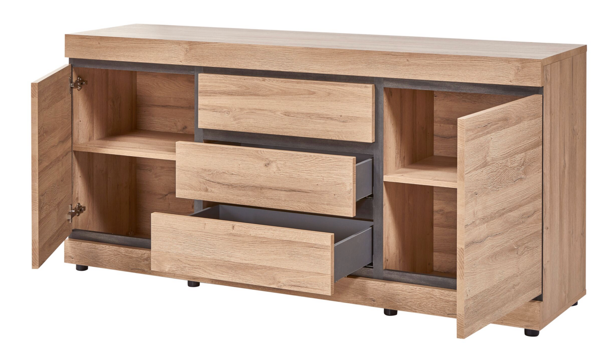 Aan beide zijden bevindt zich een deurkast met legplanken, ideaal voor servies, glaswerk of andere woonaccessoires. In het midden zijn drie ruime laden geplaatst waarin je kleinere spullen overzichtelijk kunt opbergen.