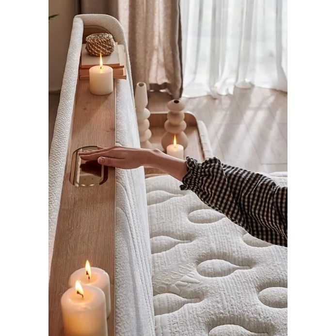 De CAPPADOCIA NATURA boxspring van BAMBI combineert natuurlijke mineralentechnologie met moderne functionaliteit voor een luxueuze en rustgevende slaapervaring. De speciale stof met Cappadocia kleimineralen ondersteunt ademend vermogen en thermische balans, terwijl Far Infrared technologie helpt bij ontspanning en temperatuurregulatie tijdens de slaap. De slimme boxspring is uitgerust met praktische opbergruimte, LED verlichting met bewegingssensor en geïntegreerde USB en Type-C aansluitingen. Het stijlvolle hoofdbord met zachte bekleding en houten legplank voegt zowel comfort als functionaliteit toe aan de slaapkamer.