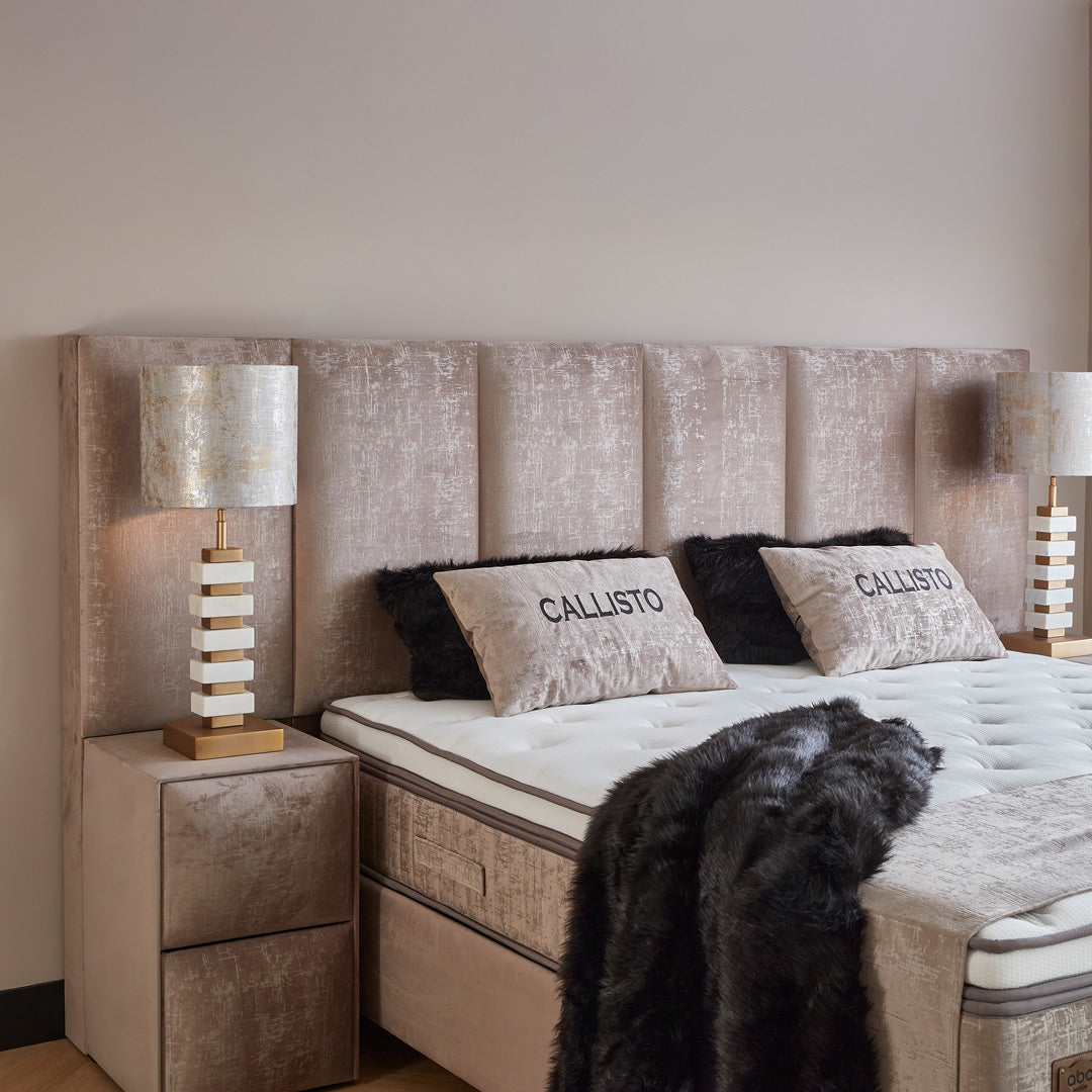 Het hoofdbord van het Calisto opbergbed heeft een stijlvol ontwerp met verticale blokken. De blokken zijn gelijkmatig verdeeld over het oppervlak van het hoofdbord en geven het bed een strakke en moderne uitstraling. De blokken op het hoofdbord zijn bekleed met een zachte stof. Het bedframe is stevig en duurzaam, en de bekleding is zorgvuldig geselecteerd om de beste kwaliteit en comfort te bieden.