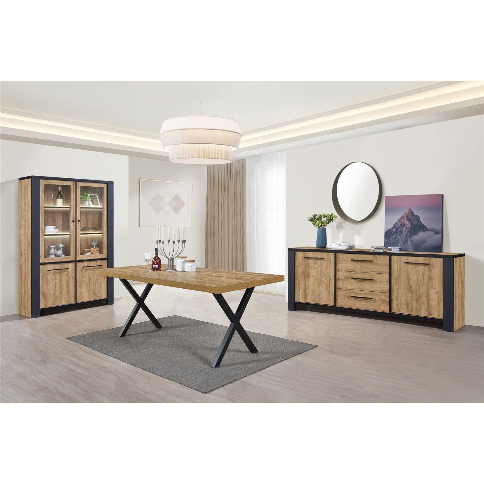 De Eetkamer Samuel in Denver Oak kleur combineert landelijk design met een industrieel accent in het zwart. Deze 3-delige set bestaat uit een dressoir van 230 cm, een glaskast van 130 cm en een eetkamertafel van 200 cm, perfect voor een stijlvol en functioneel interieur. Het warme Denver Oak biedt een natuurlijke uitstraling, terwijl de zwarte accenten een moderne, industriële touch geven. Ideaal voor wie een gezellige, maar eigentijdse eetruimte wil creëren.