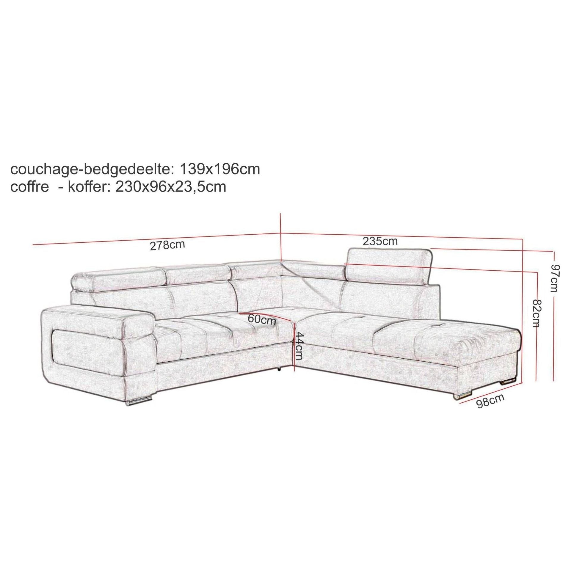 Opstelling: Arm 3-zit + Hoek + Meridienne (bed+koffer) / Meridienne + Hoek + 3-zit arm (bed+koffer)