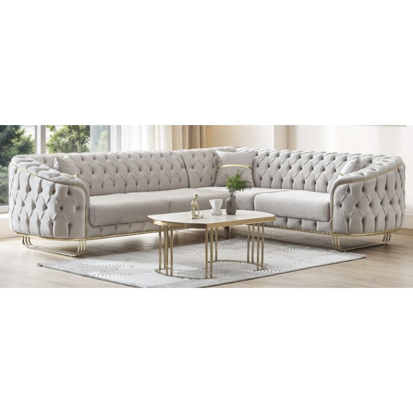 De Nartemis hoeksalon straalt pure elegantie en luxe uit dankzij de prachtige capitonné bekleding en verfijnde goudkleurige accenten.