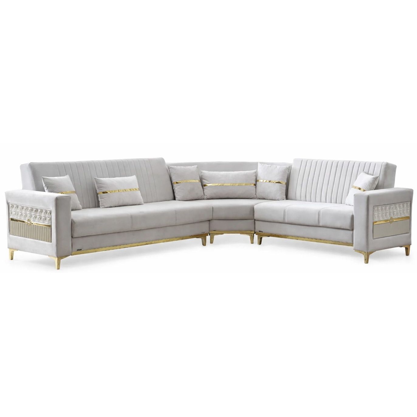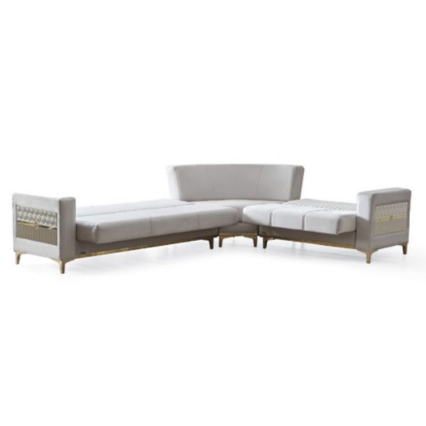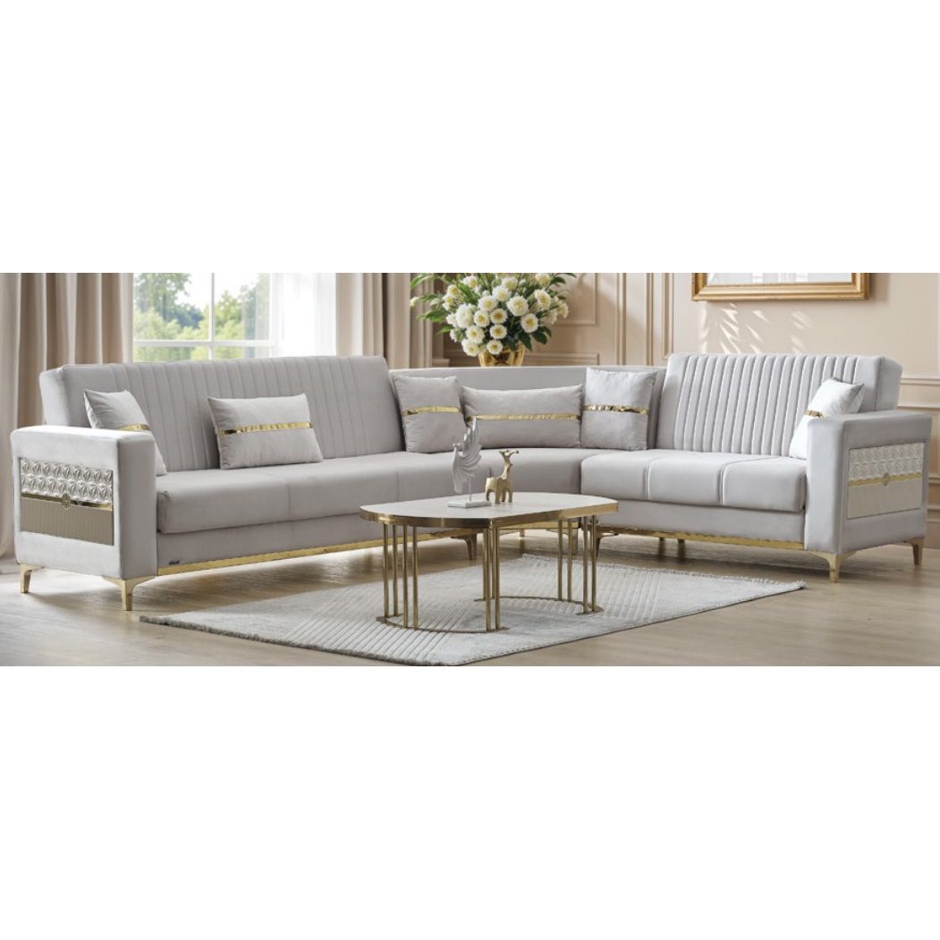 De Torino hoeksalon onderscheidt zich door de fijne stikafwerking en luxe goudkleurige accenten die de zetel een chique, moderne uitstraling geven.