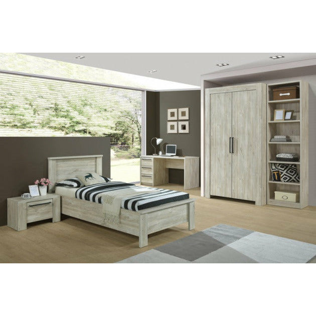 Kinderkamer Ivy is een stevige en moderne kamer afgewerkt in Beach Oak kleur. Deze kamer bevat een bed, een nachtkastje en een kleerkast.