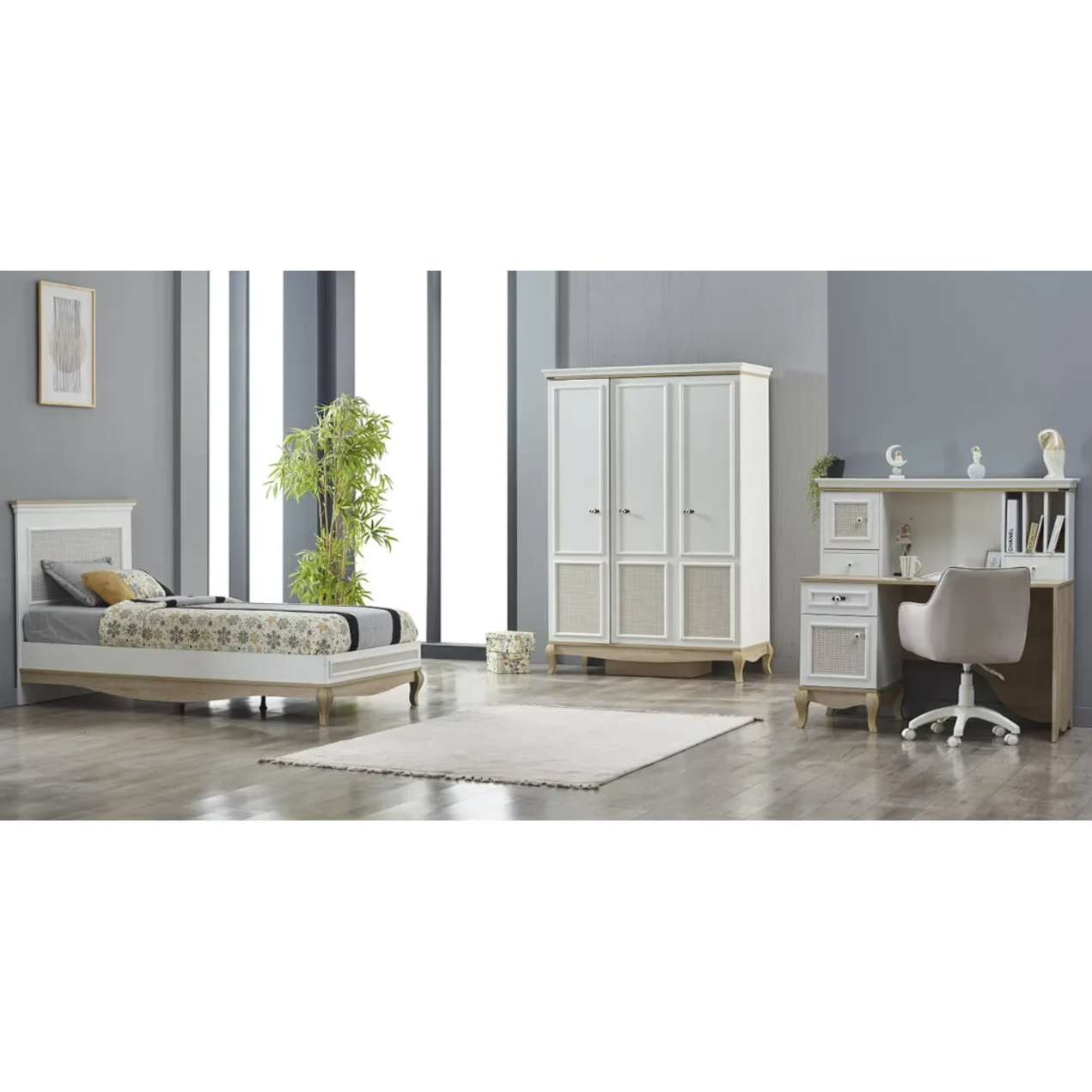 Ben je op zoek naar een neutrale en kwaliteitsvolle kinderkamer? Dan is kinderkamer SOFIA precies wat je zoekt! Deze kamer heeft heel wat te bieden. Zo vind je er een bed, een nachttafel, een kledingkast, een bureautafel en nog heel wat andere opbergmeubelen! Deze meubelen zijn gemaakt uit Melamine en beschikken steeds over een schitterende kwaliteit. De ideale kamer voor je kindje!