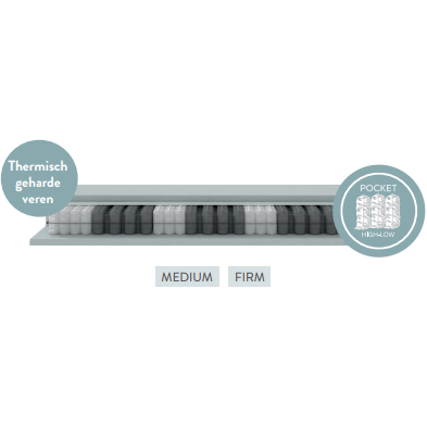 De AUDREY matras combineert de ondersteuning van hoog-laag pocketveren met het comfort van koudschuim voor een stabiele en ergonomische nachtrust. De 7 comfortzones zorgen voor een optimale drukverdeling en correcte lichaamsondersteuning, terwijl de thermisch geharde veren extra duurzaamheid bieden. De luxueuze hoes met extra schuimlagen, verluchtingsringen en handgrepen verhoogt het ligcomfort en zorgt voor een fris slaapklimaat.
