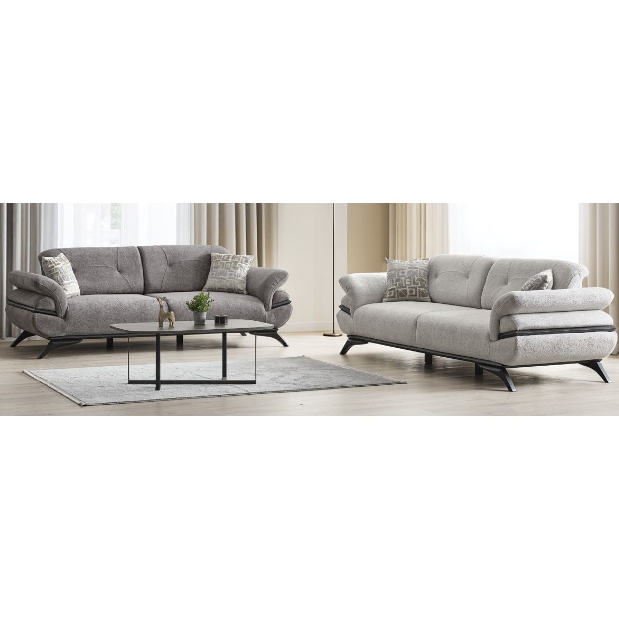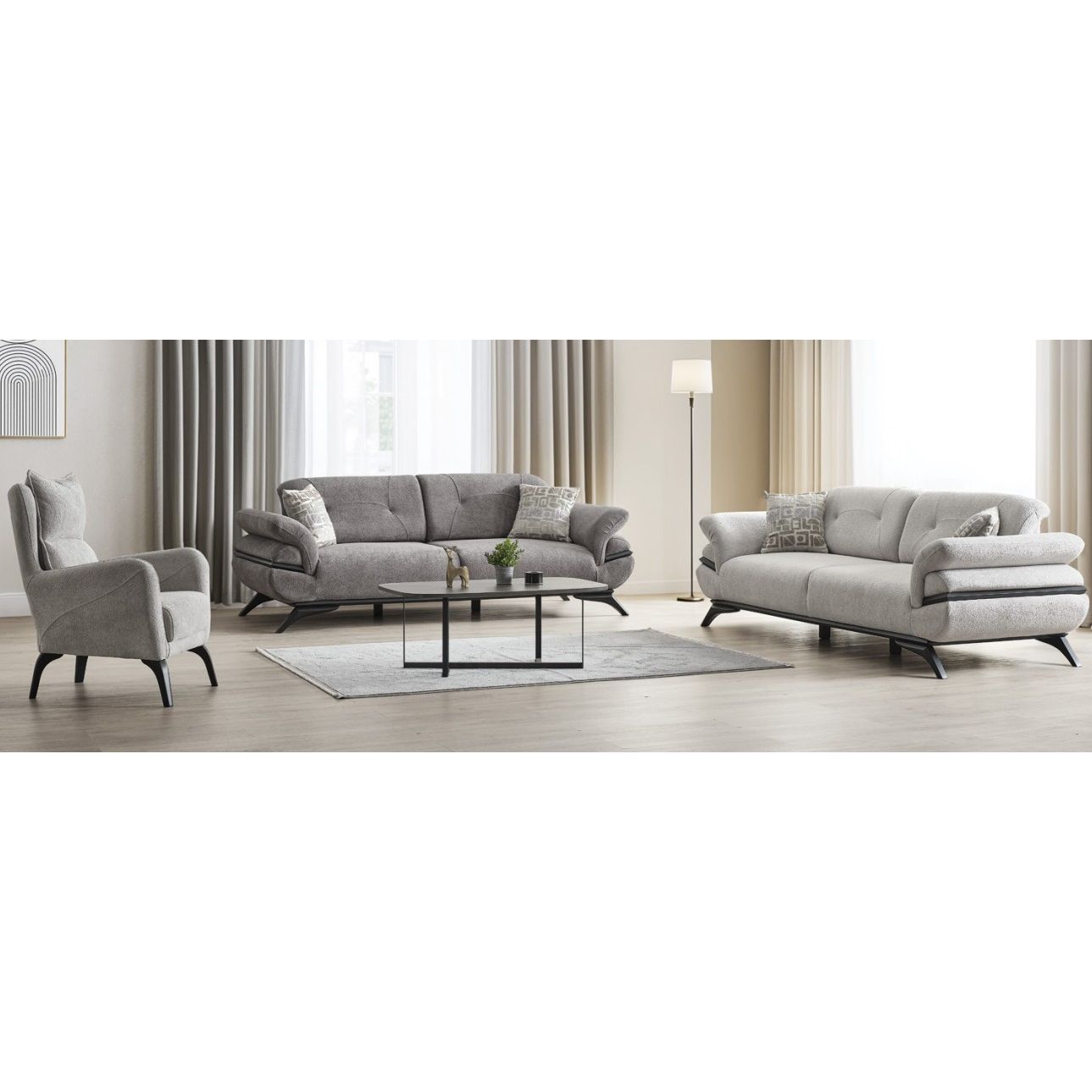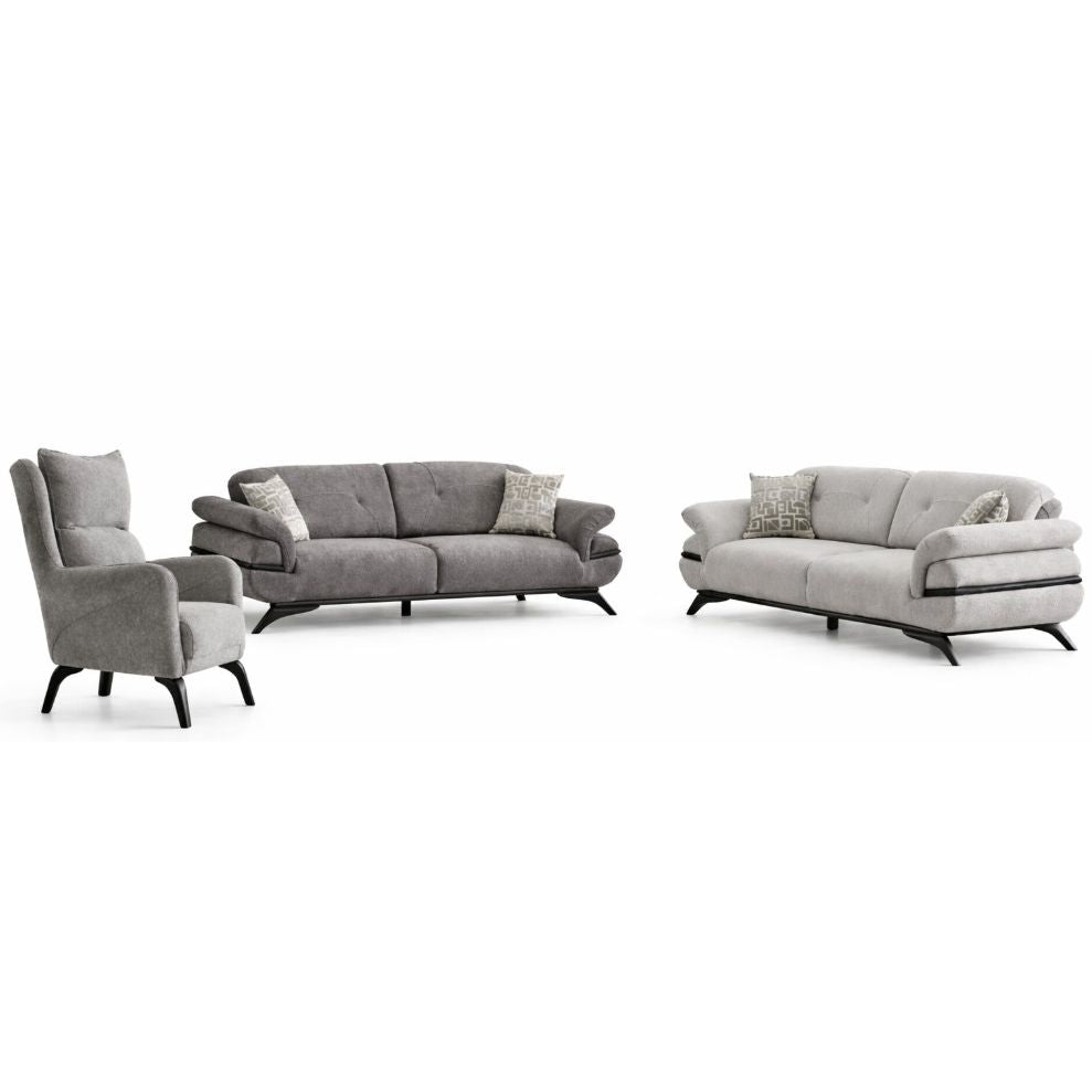De Elegance salonset valt op door zijn zachte stofstructuur en stijlvolle vormgeving. Hij brengt een esthetische én comfortabele sfeer in je leefruimte, terwijl de moderne belijning zorgt voor een tijdloze en harmonieuze uitstraling.
