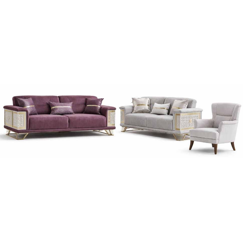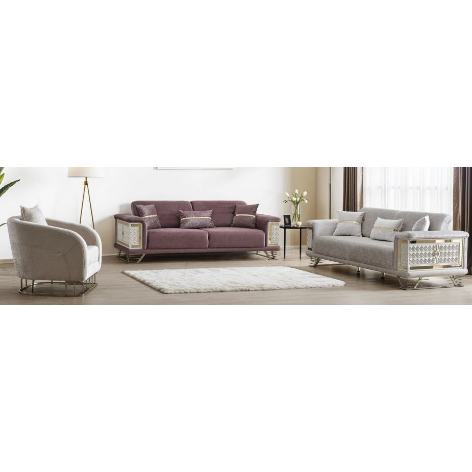 De Oscar salonset brengt een chique en luxueuze sfeer in je leefruimte dankzij de opvallende decoratieve zijpanelen en elegante goudkleurige details. De rijke stofstructuur en verfijnde pootafwerking zorgen voor een harmonieus samenspel tussen stijl en comfort.