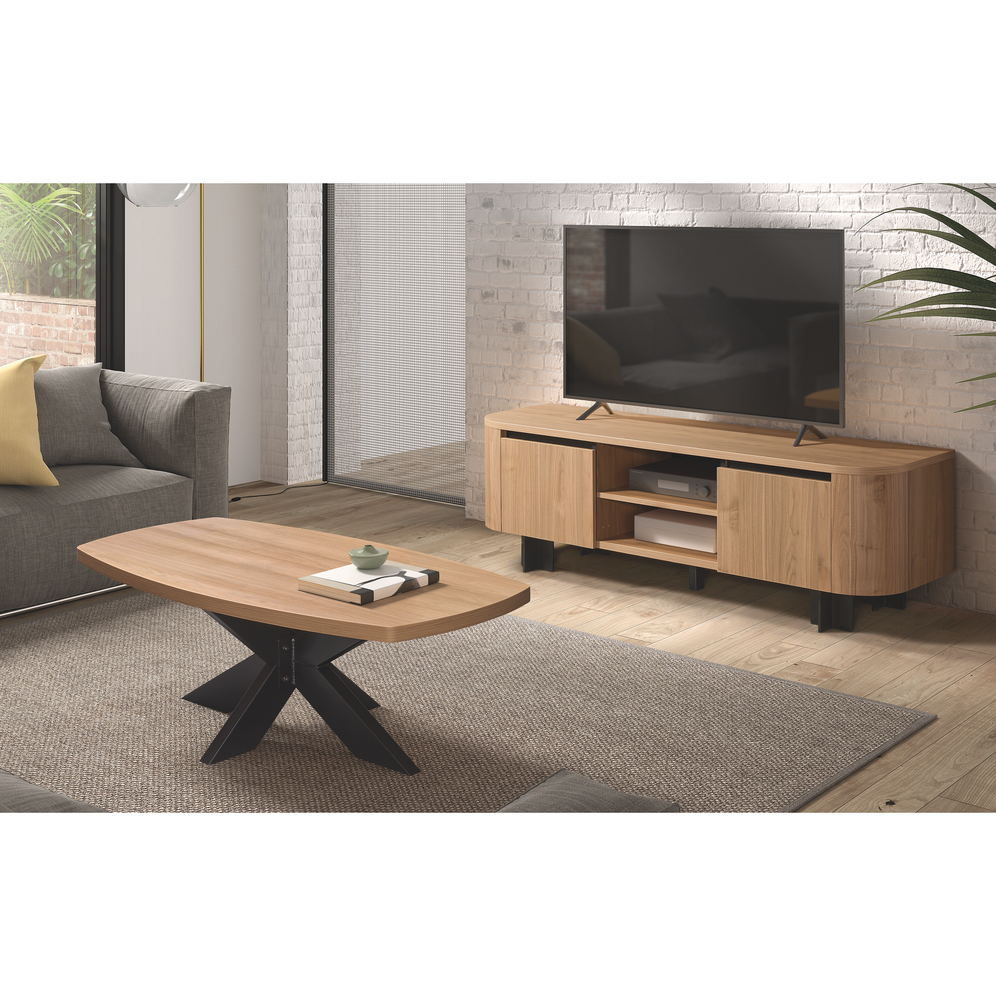 De TV kast VALERIO combineert moderne elegantie met praktische opbergruimte. De warme kleur Licht Notelaar geeft je woonkamer een natuurlijke en stijlvolle uitstraling, terwijl de afgeronde zijkanten zorgen voor een zachte, hedendaagse look. Dankzij de ruime indeling met gesloten opbergruimte en open vakken berg je eenvoudig al je multimedia-apparatuur, kabels en accessoires netjes op. De zwarte accenten en het strakke onderstel geven het meubel een subtiele moderne touch. VALERIO is de perfecte keuze voor wie houdt van design én functionaliteit in één meubel.